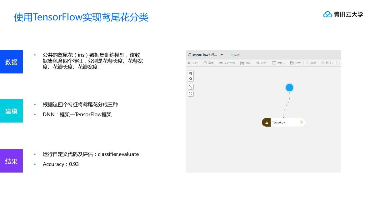 智能钛机器学习平台的 Tensorflow 框架为用户提供了基于 Python API 的 Tensorflow 运行环境,用户可将编写好的脚本及依赖文件上传至框架进行算法训练。我们将以鸢尾花分类任务为例,向用户演示,如何利用智能钛机器学习平台的深度学习框架 TensorFlow 运行自定义代码,如何通过工作流页面向自定义代码传参,如何查看代码日志/报错信息等。整个工作流运行耗时仅几十秒,训练完成后您可进行模型服务部署和在线测试。