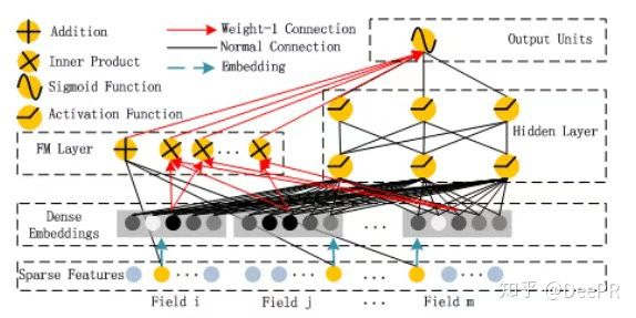 那么接下来看DeepFM是怎样在这个基础上沿着构建更好的高阶特征提取结构的思路上发展的,如图 4 为DeepFM [4] 模型结构,可以看出,该模型基本上是把wide部分替换成了FM结构,相当于左边是FM来提取二阶特征,右边是多层感知机提取高阶特征。