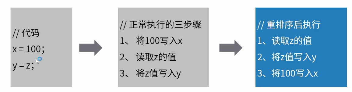 - 那么什么样的场景下会发生呢: 指令重排场景:当CPU写缓存时发现缓存区块正被其他CPU占用,为了提高CPU的处理能力,可能将后面的读缓存命令优先执行。