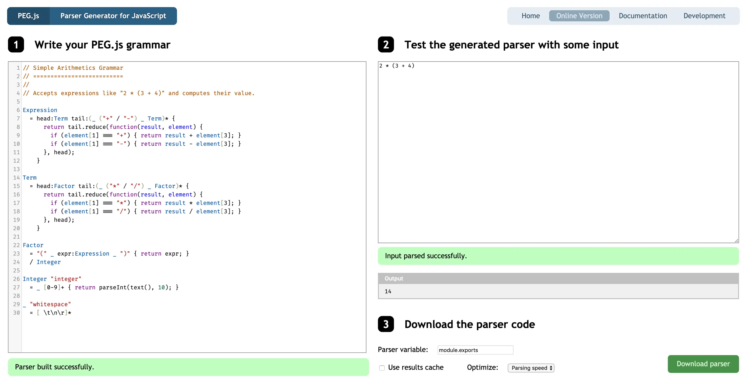 其全称为Parser Generator for JavaScript,顾名思义,是用来生成语法解析JS文件的一个工具,文档描述相当简单,官网还贴心地给出了一个online工具,可以左边写parser定义,右边即时校验。