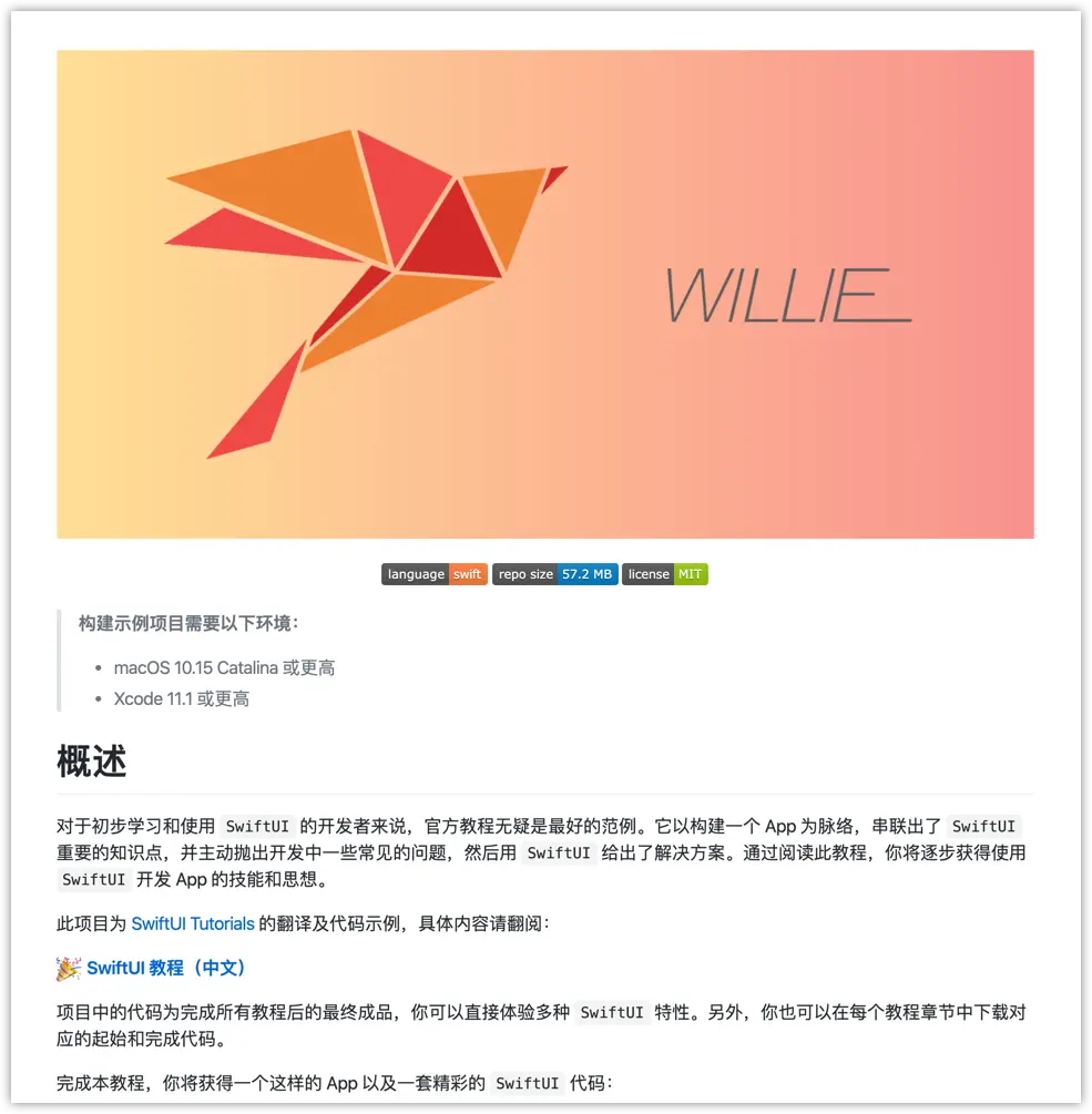 在 WWDC 2019 上,Apple 推出了一个全新的现代化的 UI 界面编码框架 SwiftUI 以及响应式编程框架 Combine 。我非常赞叹于它们结合后给开发效率带来的提升,我认为这就是未来构建 Apple 系 App 的方向。所以在官方发布了相关英文教程后,我第一时间进行翻译,产生了这个项目 SwiftUI-Tutorials 。