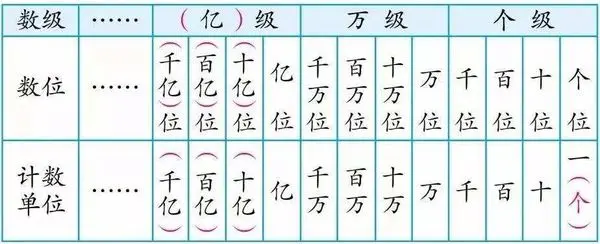 - 整数部分,按四位分级法来处理,四位分级法就是以四位数为一个数级的分级方法,如图所示: