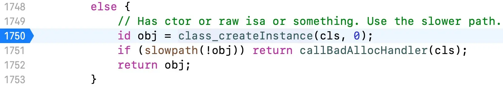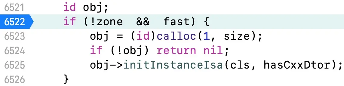 id obj = (id)calloc(1, cls->bits.fastInstanceSize());