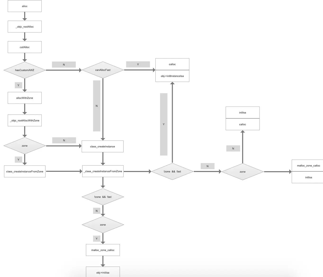 我们通过最常见的alloc函数源码分析出了对象创建的大体流程,下面用一张流程图总结一下alloc创建对象的过程: