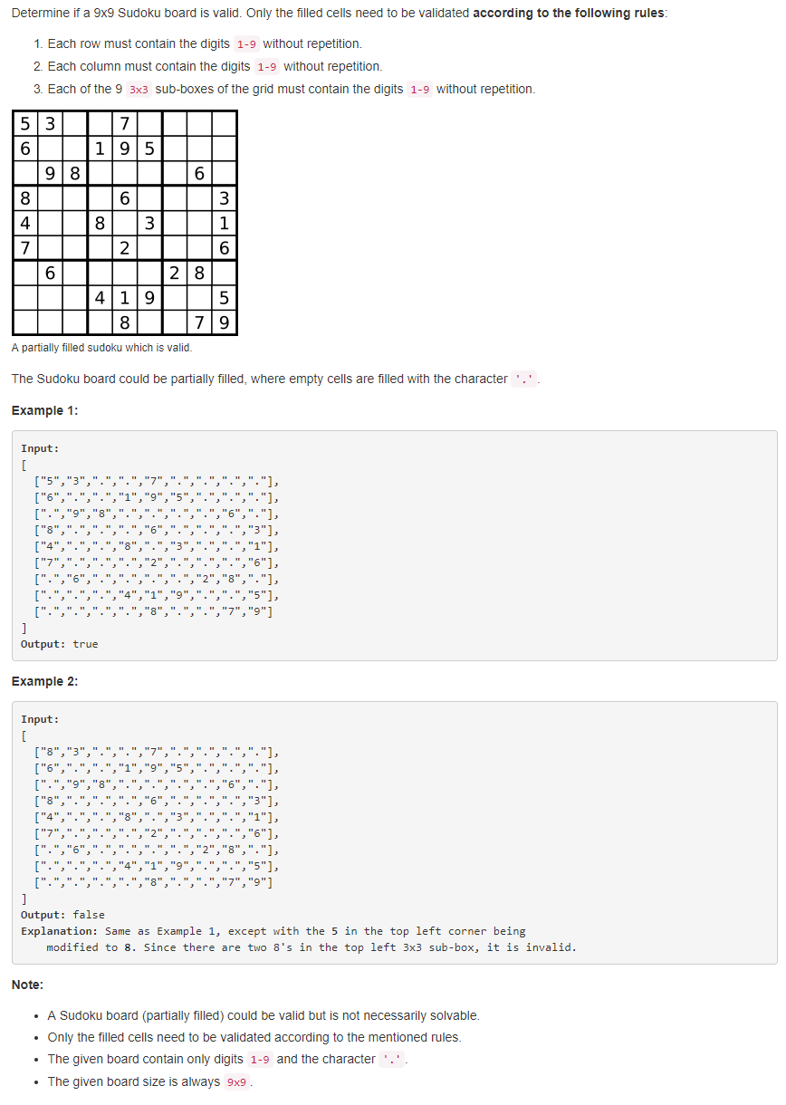 一个 9 * 9 的数独的棋盘。判断已经写入数字的棋盘是不是合法。需要满足下边三点,