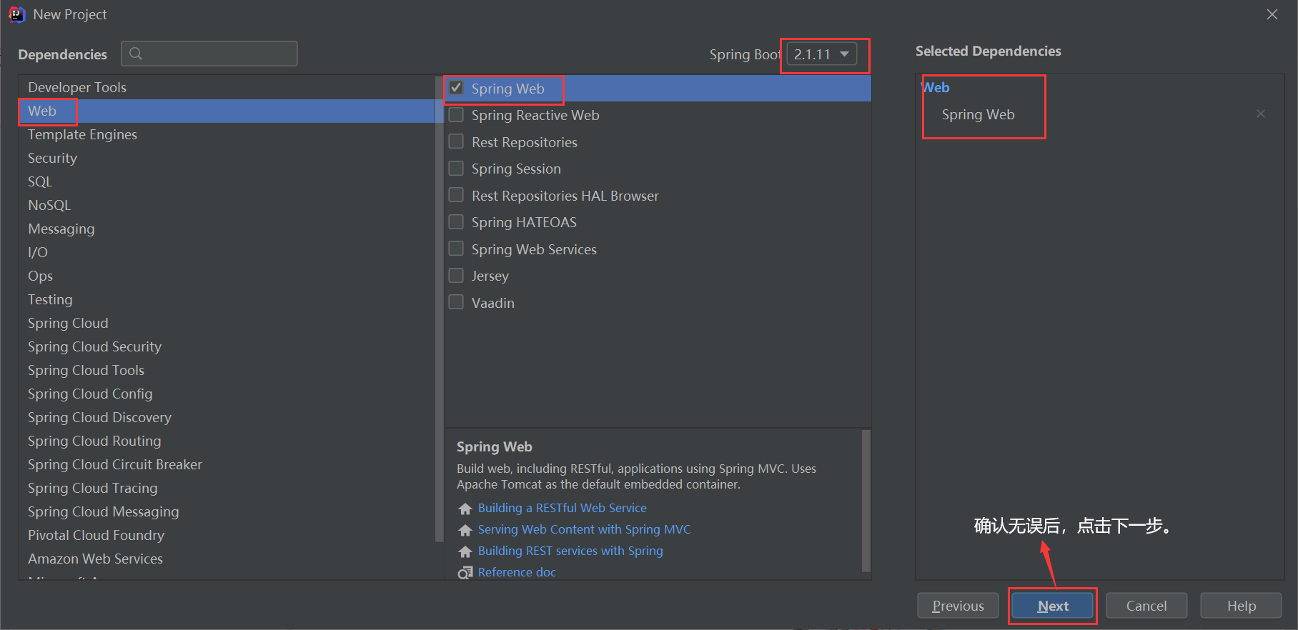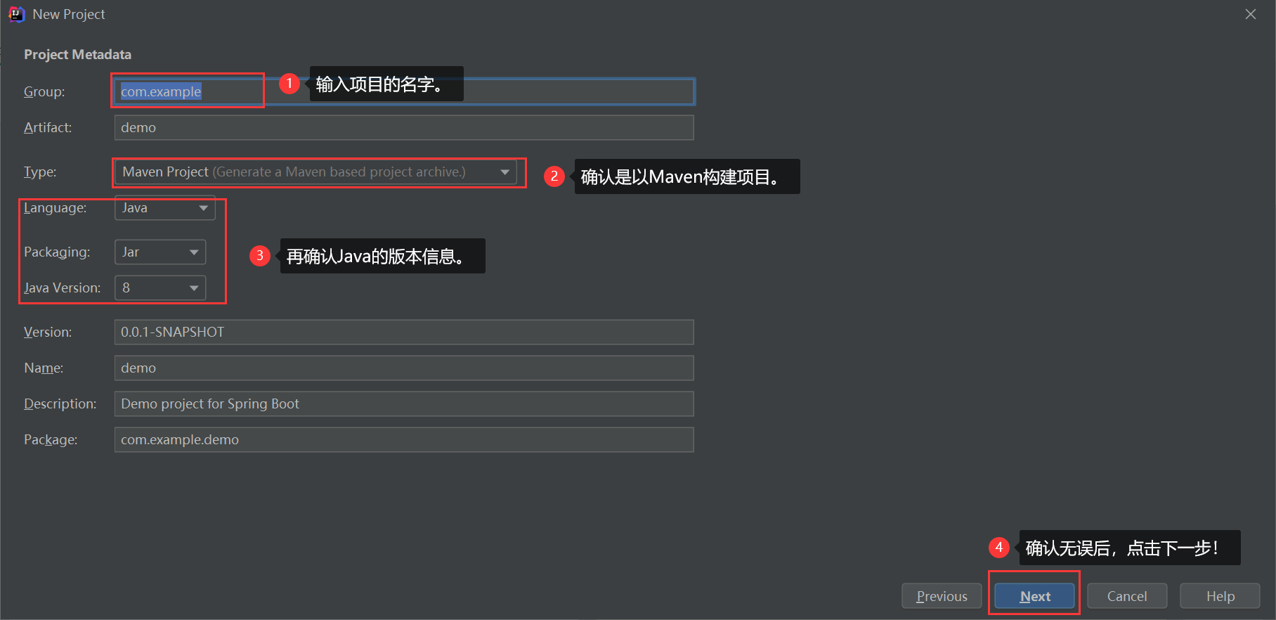 2.选择使用 Maven Project、java、Spring Boot 版本2.1.11以及项目的一些基本信息,参考图如下: