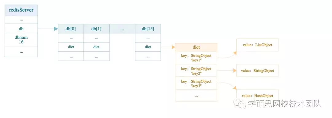 由此可见,redisServer、redisDb 和 dict 字典的关系可以用下图来表示(dict 的结构在后面会具体介绍,这里先了解一下 redisDb 与 dict 的关系即可):