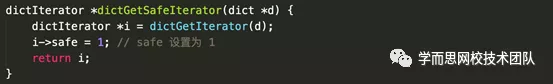 获取安全迭代器的方法如下,其实就是调用了dictGetIterator 方法,然后将 safe 标记为1,表示使用安全迭代器: