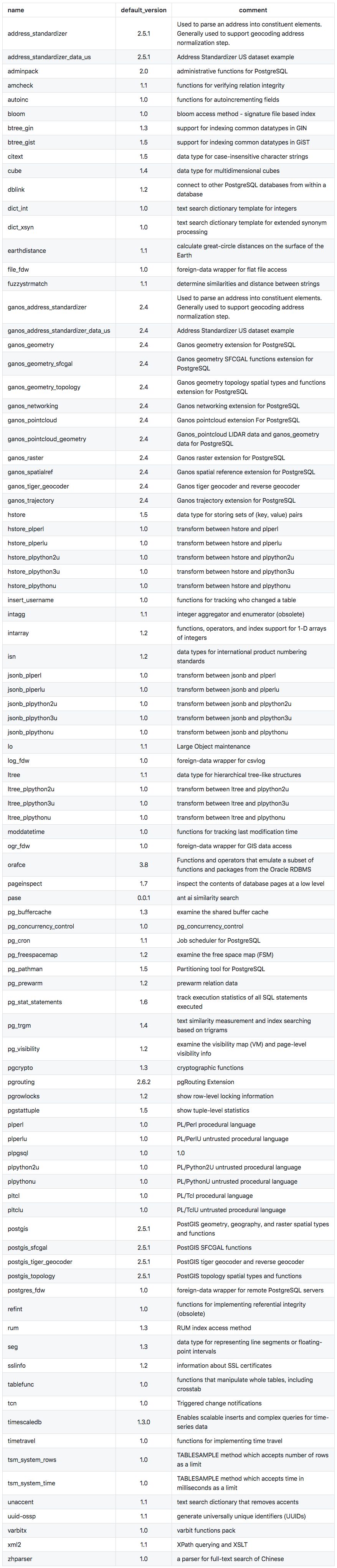 2019-12 查询到的阿里云 PostgreSQL 11 支持的插件列表(目前 11 支持高可用版本)