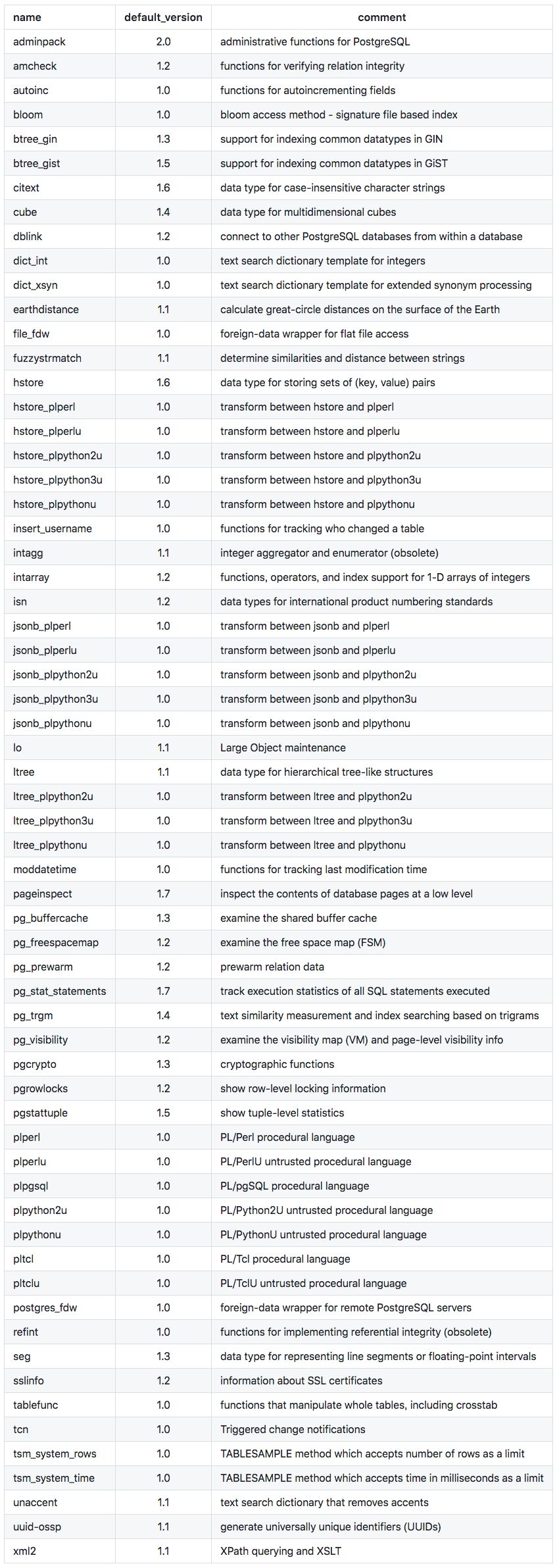 SELECT * FROM pg_available_extensions order by name -