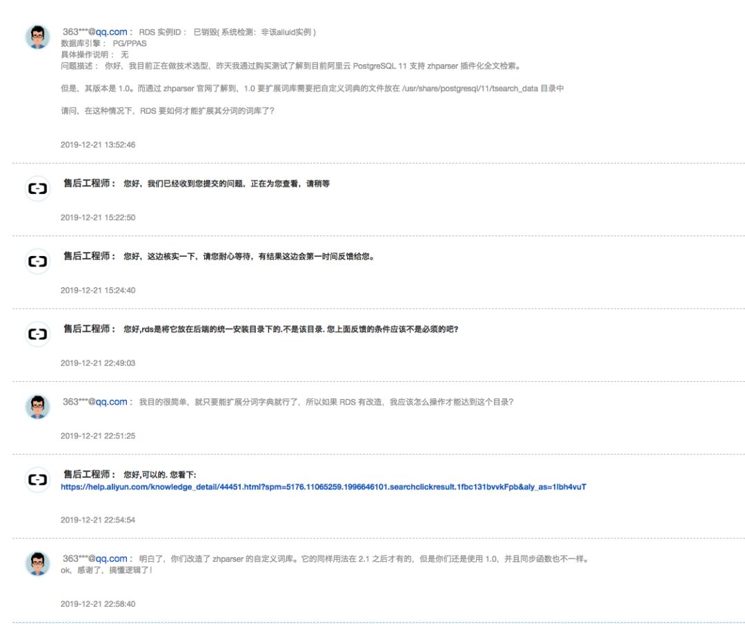 先查看没有扩展之前的效果:保障 房 资金 压力SELECT * FROM ts_parse('zhparser', '保障房资金压力'); 现在把 资金压力 插入到自定义表中insert into zhparser.zhprs_custom_word values('资金压力');同步数据select sync_zhprs_custom_word();断开当前连接,重新建立连接,再查询:资金压力 就为一个词了SELECT * FROM ts_parse('zhparser', '保障房资金压力');特别说明,阿里云的 zhparser 虽然显示是 1.0 版本,但是通过工单沟通后了解到他们改造了这个插件,所以版本没用。他们的自定义词库是这样用的:https://help.aliyun.com/knowledge_detail/44451.html表名和函数都进行了重命名:insert into pg_ts_custom_word values ('保障房资');select zhprs_sync_dict_xdb();SELECT to_tsquery('zhparser', '保障房资金压力');