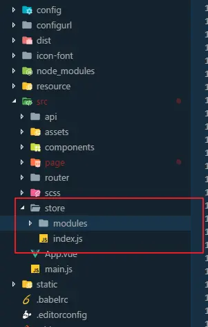 - 在脚手架中的src文件夹下,先创建一个小的文件夹存放这个vuex,并且创建一个叫index.js的文件文件目录结构