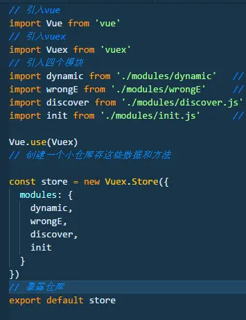 - index.js 的文件中是引用vuex的一些配置文件,并且创建仓库,存储一些模块index.js中文件的内容