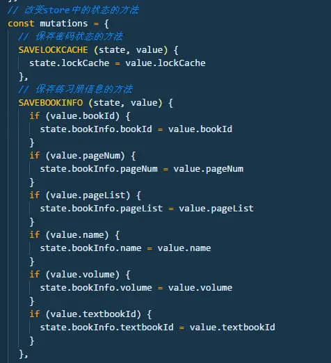 import {mapState, mapMutations} from 'vuex'computed: { ...mapState({ 'lockCache': state => state.discover.lockCache, }), }, methods: { ...mapMutations({ 'saveLock': 'discover/SAVELOCKCACHE', 'saveBook': 'discover/SAVEBOOKINFO', }), toPage (val) { // 去练习册内页的方法 if (this.isEdit) { return } // this.saveLock({lockCache: false}) // this.updatePage({pageNum: 0}) // 保存点击的练习册的相关信息,方法和上述相同 this.saveBook({ gradeId: val.grade, bookId: val.id, name: val.name, volume: val.grade * 2 - val.volume + 1, textbookId: val.textbookId }) this.$router.push('/discover/book/bookpage') },}
