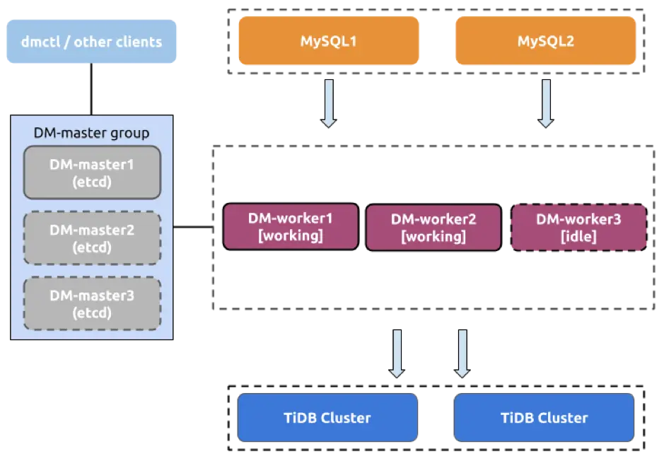 让 TiDB 自研的 DM(从 MySQL 迁移数据到 TiDB 的工具) 支持了高可用的特性,使得用户免于遭受在节假日甚至凌晨发现挂掉一台服务器而紧急 OnCALL 的苦恼,也为 DM 可以用在一些关键场景中做了铺垫。