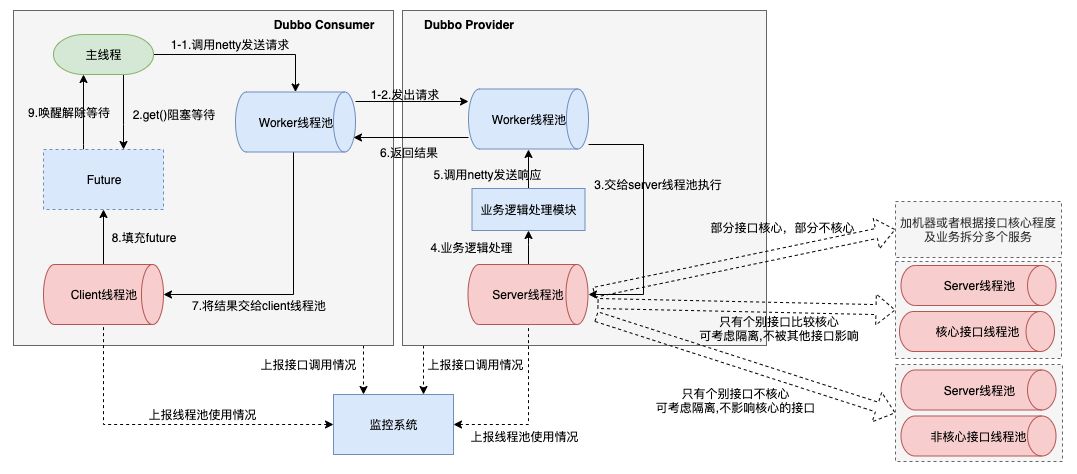 2)Dubbo 线程池隔离:可以隔离出核心接口,也可以把个别非核心接口隔离。主要防止非核心接口出问题时打满 Dubbo 线程池,影响核心接口的服务能力。举个实际的场景,某核心应用增加了一个非核心的 Dubbo 接口,量级大而且响应时间较长,这个接口不断抢占 provider 的线程池资源,导致这个应用的核心 Dubbo 接口出现拿不到连接的情况,这时候就可以将这个非核心的 Dubbo 接口隔离使用单独的线程池,就可以不影响核心接口了。