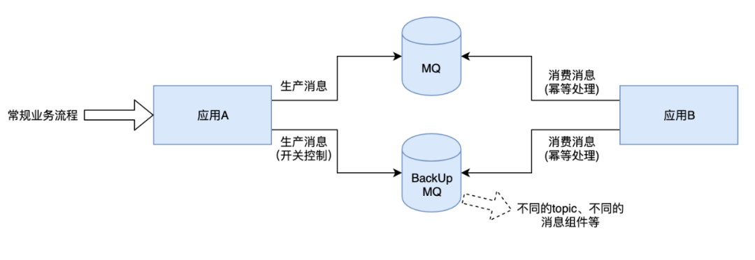 这个主要应对单个 MQ 无法正常发送消息、或者消费严重堆积的场景。比如之前出现过单个机房 zk 故障导致 MQ 部分 topic 发送失败。