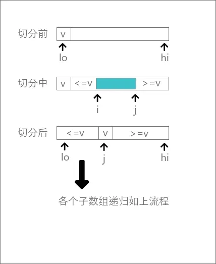 - 对却分后的子数组重复上述流程:sort(array, lo, j - 1);sort(array, j + 1, hi)。直至递归结束