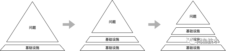 技术在发展中会对当前的解决方案不断的抽象,总结和提炼,逐渐分离出其中的变化的部分与不变的部分,让原来的问题变得收敛,开发的关注点会变的更聚焦,开发效率得以提升。这样会出现分层,进而沉淀出基础设施,这也是技术体系演进的一般规律,如图 1-1。