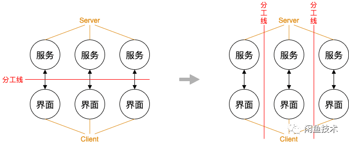 在一体化的场景下,业务可以由一个同学负责前后端的开发,最大限度的减小沟通协作成本。当然,大体量的业务必然需要协作的,但协作的方式有所改变,工作的划分可以由传统的前后端的横向划分,变成前后一体的垂直划分,如图 3-1,协作方式的改变也会影响到我们设计的思路。