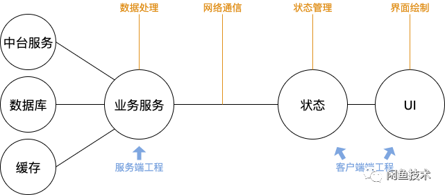 先来看看当前的业务开发形态,如图 2-1,当前在业务开发中几个主要的关注点我大概的归纳为:数据处理,网络通信,状态管理和界面绘制。从这4个点出发,逐一思考,在新的一体化的场景下会有什么变化: