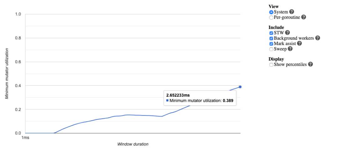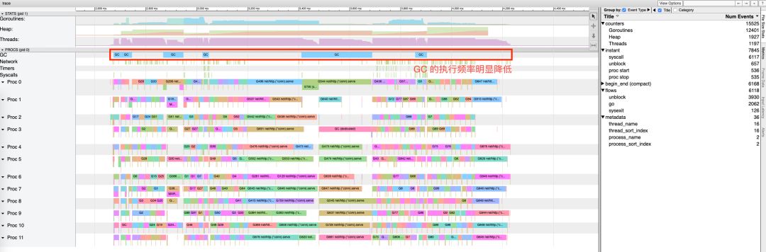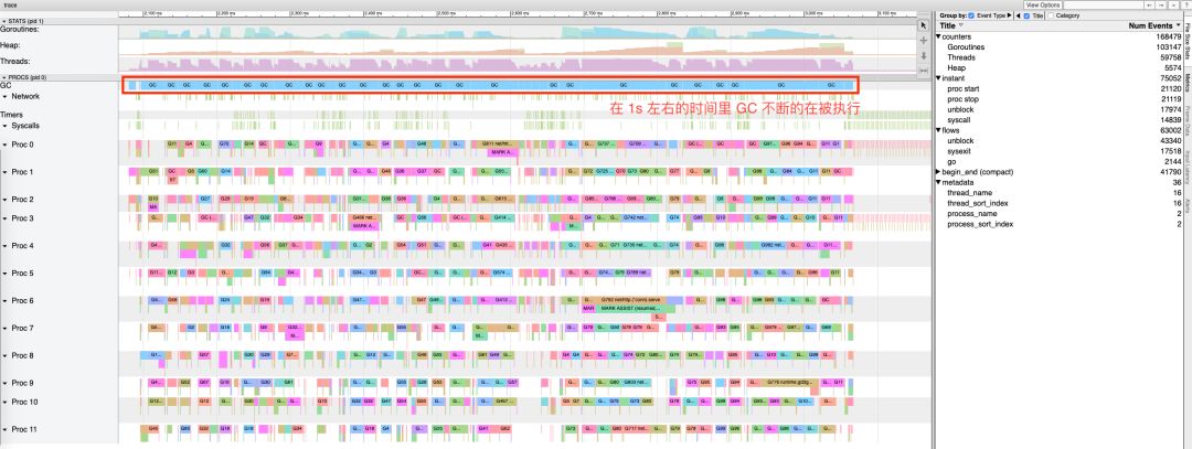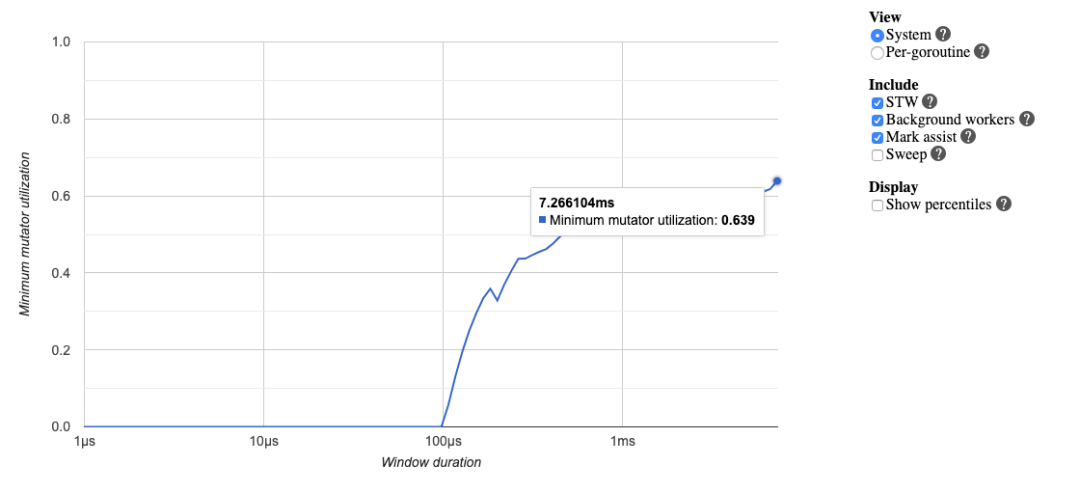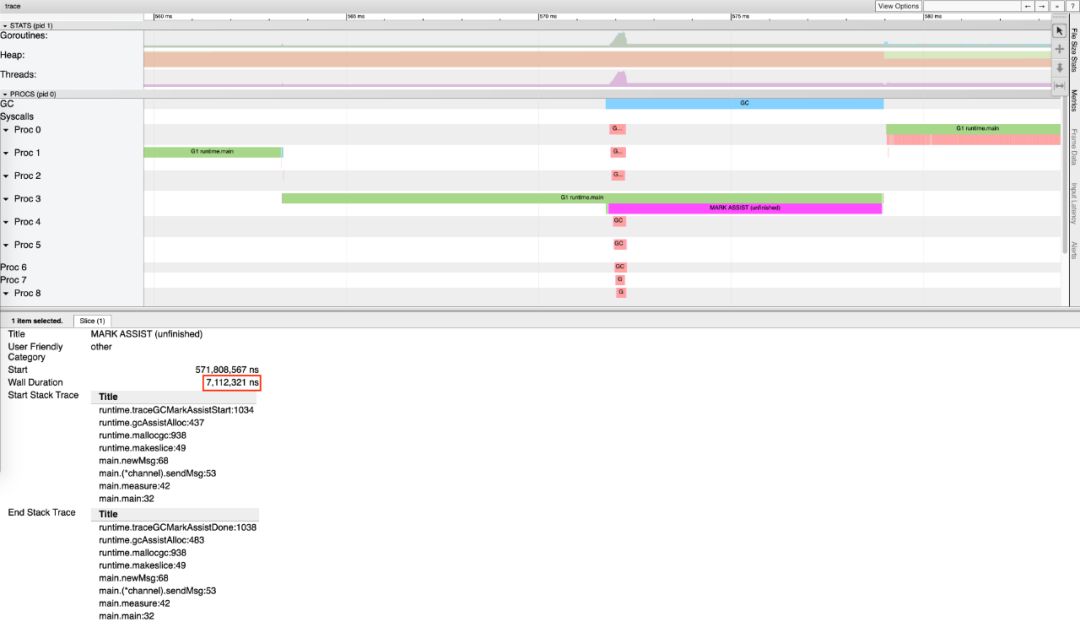 可以发现,这个时间段中,Mark Assist 执行了 7112312ns,约为 7.127915ms; 可见,此时最坏情况下,标记辅助拖慢了用户代码的执行,是造成 7 毫秒延迟的原因。