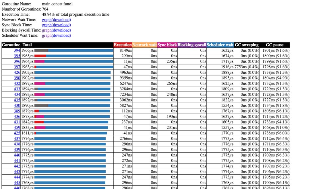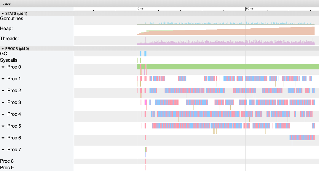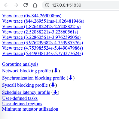 $ go tool trace trace.out2019/12/30 15:50:33 Parsing trace...2019/12/30 15:50:38 Splitting trace...2019/12/30 15:50:45 Opening browser. Trace viewer is listening on http://127.0.0.1:51839