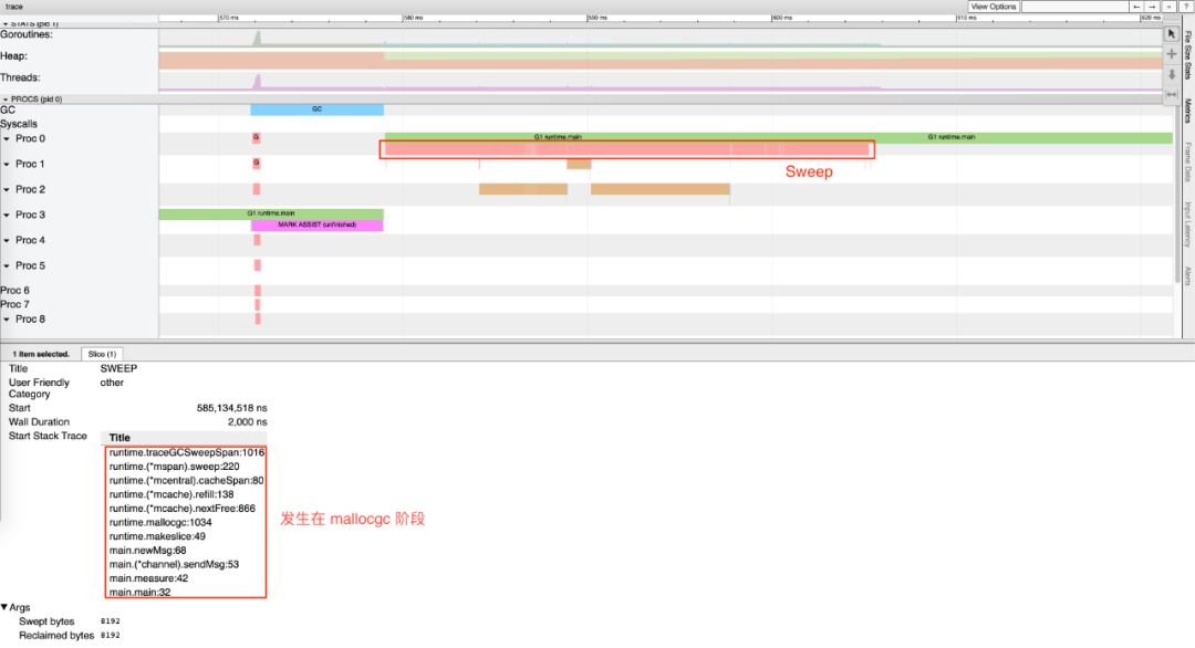 同样还是刚才的例子,如果我们仔细观察 Mark Assist 后发生的 Sweep 阶段,竟然对用户代码的影响长达约 30ms,根据调用栈信息可以看到,该 Sweep 过程发生在内存分配阶段: