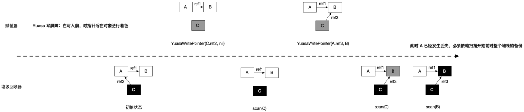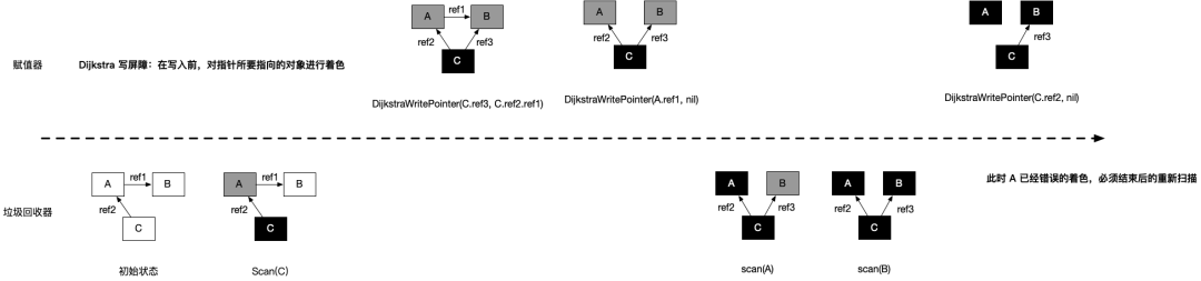 正如我们前面所说,允许灰色赋值器存在的垃圾回收器需要引入重扫过程来保证算法的正确性,除了引入混合屏障来消除重扫这一过程外,有另一种做法可以提高重扫过程的性能,那就是将重扫的过程并发执行。然而这一方案并没有得以实现,原因很简单:实现过程相比引入混合屏障而言十分复杂,而且引入混合屏障能够消除重扫这一过程,将简化垃圾回收的步骤。