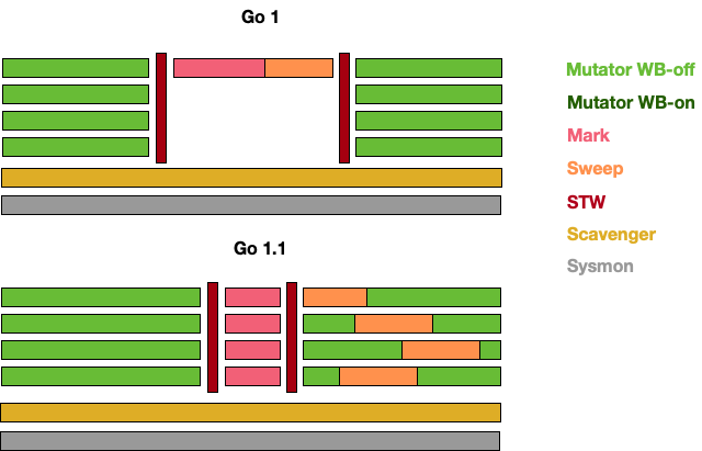 Go 1.12:整合了两个阶段的 Mark Termination,但引入了一个严重的 GC Bug 至今未修(见问题 20),尚无该 Bug 对 GC 性能影响的报告