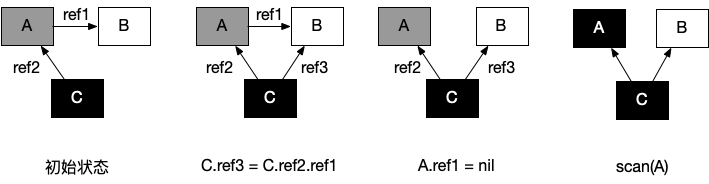 从垃圾回收器的视角来看,三色抽象规定了三种不同类型的对象,并用不同的颜色相称: