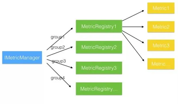 2、 metrics 里面还有一个 group 的概念,而这只能由 MetricManager 来进行管理,至少交给 MetricRegistry 是不合适的。