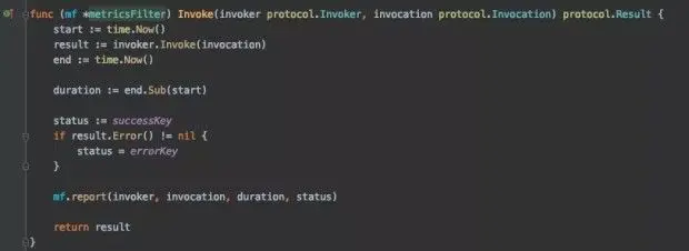 在 dubbo-go 里面这次实现了 metricsFilter ,它主要就是收集调用次数和响应时间,其核心是: