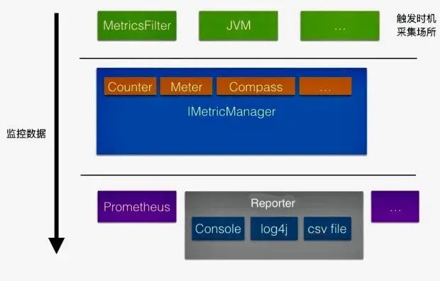 2、另外一个则是如同 Prometheus 。每次 Prometheus 触发了 collect 方法,那么它就会把每种(如 Meter, Gauge )里面的数据收集过来,然后上报,可以称为是定时采集;