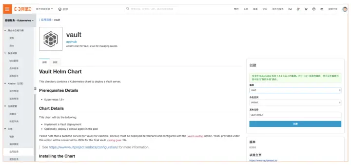 在容器服务控制台的应用目录apphub中,我们同样可以找到kubernetes-vault,方便开发者使用helm直接在集群指定命名空间一键部署。Vault也计划在后续自己的官方版本helm chart中增加配置项以支持上述登录认证secret的动态注入。