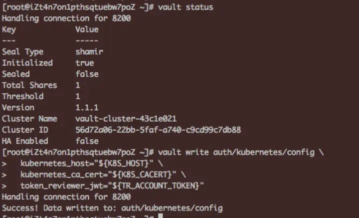 使用上,Vault管理员首先需要在后端enable kubernetes的认证方式,生成一个与Vault交互的指定sa,然后通过CLI或API将sa token和集群ca,公网地址等信息写入到Vault后端中,并配置与vault后端的ACL策略绑定。详细步骤请参见官方文档。