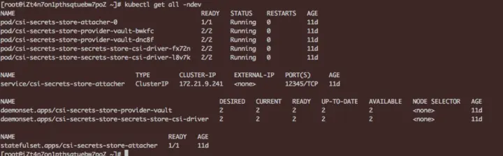 helm install . -n csi-secrets-store --namespace dev --set providers.vault.enabled=true安装成功后如下图所示: