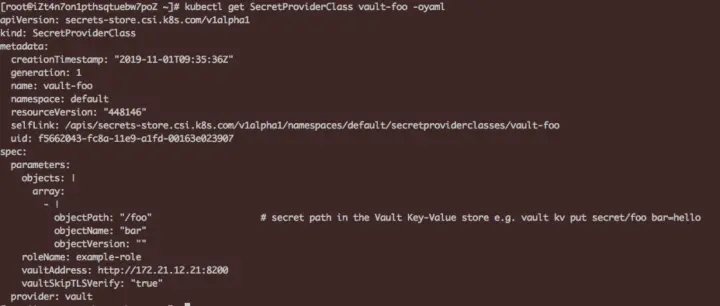 HashiCorp官方也基于此框架实现了一套对接Vault的Provider。这里我们以此为例具体来看下在一个k8s pod应用中如何通过CSI plugin的方式使用Vault中管理的secret秘钥。