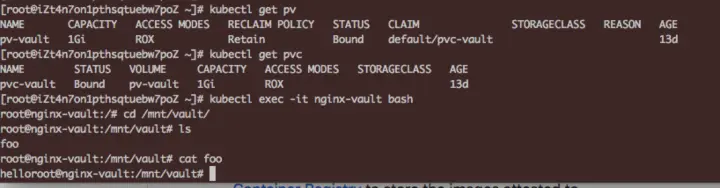 objectVersion: ""在pod实例模板中引用指定pvc即可在pod中获取到vault,这里我们在ACK集群以pv/pvc模式为例创建一个nginx应用容器实例并在其中挂载上文中我们创建的secretproviderclasses实例: