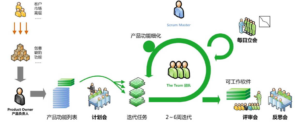 - 产品所有者:定义所有产品功能,决定产品发布的内容以及日期,对产品的投入产出负责,根据市场变化对需要开发的功能排列优先顺序,合理地调整产品功能和迭代顺序,认同或者拒绝迭代的交付。