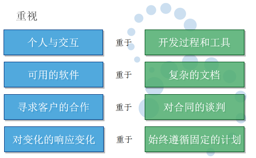 其实,在发表《敏捷宣言》之前,很多的敏捷实践都已经存在且使用了,比如:Scrum、XP、KanBan等。之所以发表《敏捷宣言》,是因为这些实践都是在单打独斗地推进敏捷开发,而不是以一个联合体的形式,且没有一个统一的指导方针。所以17位敏捷联合创始人决定发表《敏捷宣言》,共同在全世界推进敏捷开发运动。下面是敏捷宣言的4句话: