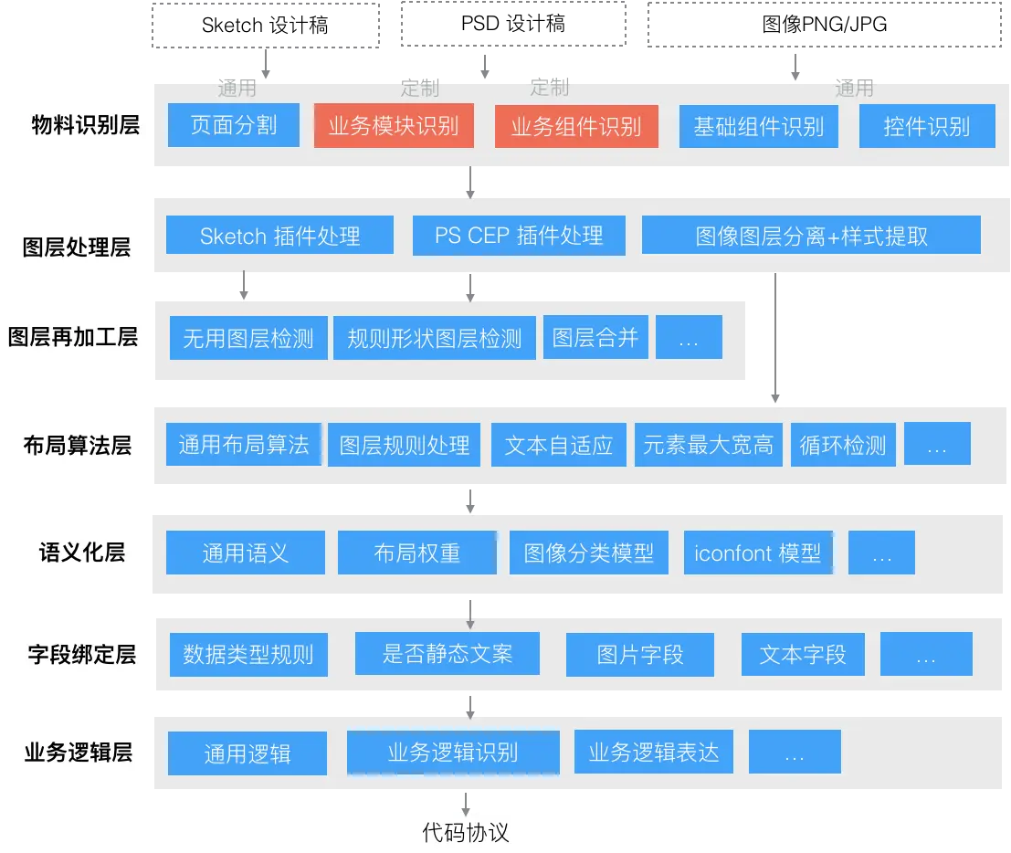如下图所示,我们的业务模块识别服务位于物料识别层,为视觉稿导出的 DSL 提供进一步的业务定制化的识别能力,在后续代码生成的过程中渗透到字段绑定、业务逻辑等功能之中。