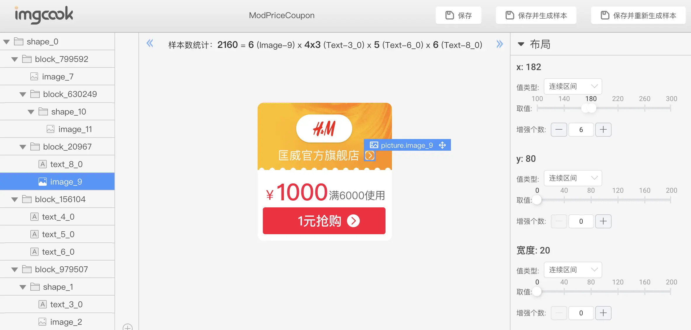 为解决样本数量问题,我们采用了数据增强的方法。数据增强有一套默认的规则,同时也是可配置的。用户可自行根据视觉稿上各个元素在真实场景中可能发生的变化,如“是否可隐藏”,“文本字数可变范围”等维度来调整属性,产出自定义的配置项。因此样本制作者可以清晰的知道自己所造样本侧重的差异点在哪里。