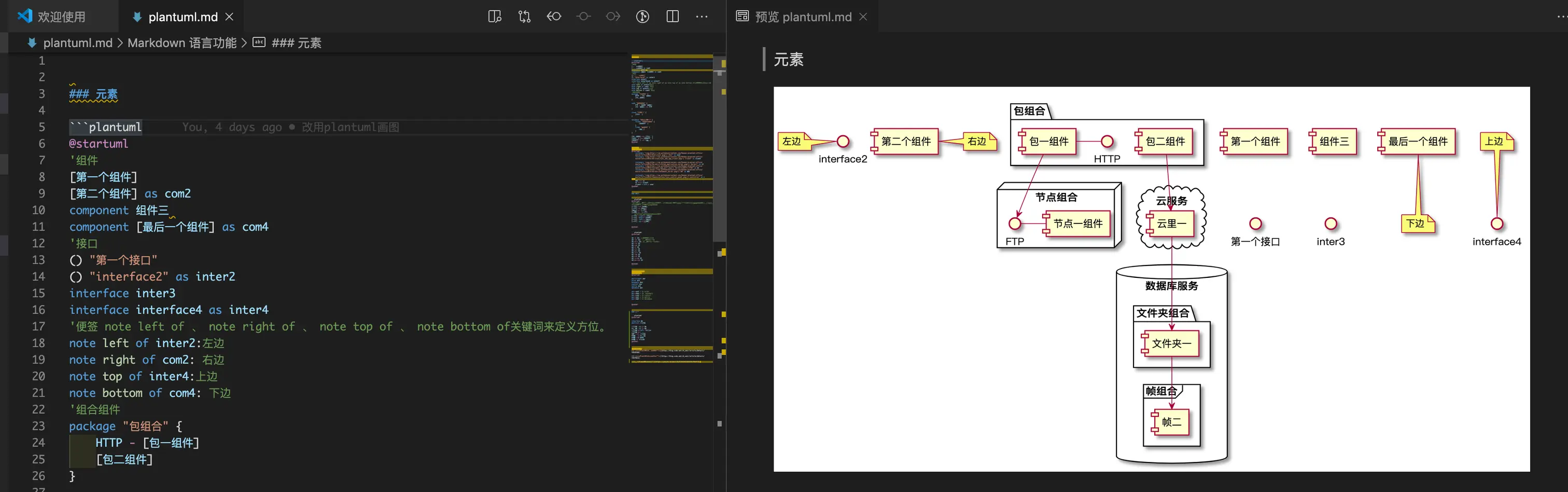 最让人欣喜的是,在vscode里面有plantuml插件,markdown对plantuml的支持也是非常棒的。见下图