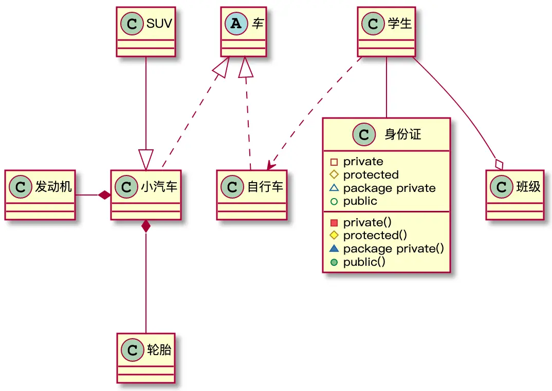 - 小汽车为与SUV之间也是继承关系,它们之间的关系为泛化关系(generalization,表现为继承非抽象类),使用带空心箭头的实线表示。SUV--|>小汽车