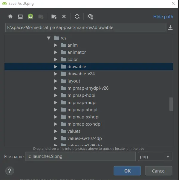 之后就是选择存储我们的点9图片,记住一定要放在drawable文件夹里。