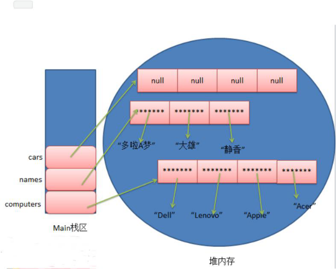 //只是指定了数组的长度,并没有显示的为数组指定初始值,但是系统会默认给数组数组元素分配初始值为null