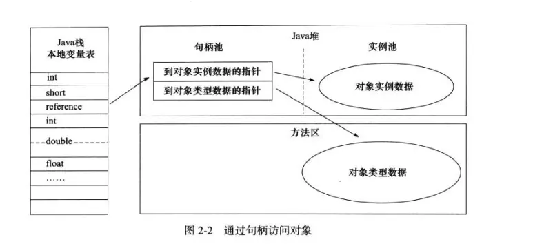 - 句柄访问。Java堆划分出一块内存作为句柄池,reference中存储的就是对象的句柄地址,句柄中包含了对象实例数据与类型数据各自的具体地址信息