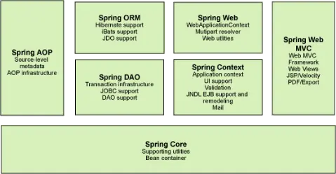 以下是Spring 框架的基本模块: Core module Bean module Context module Expression Language module JDBC module ORM module OXM module Java Messaging Service(JMS) module Transaction module Web module Web-Servlet module Web-Struts module Web-Portlet module