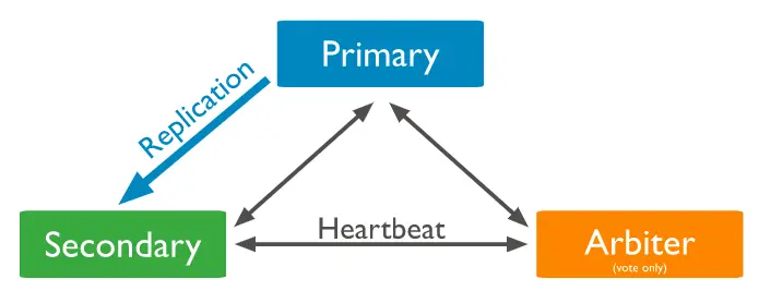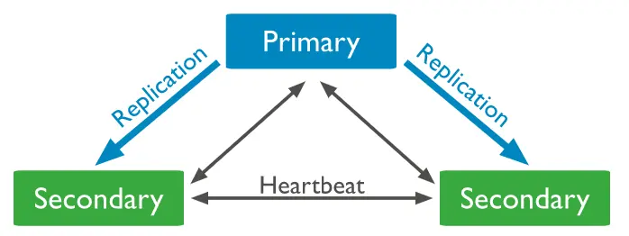 为保证数据安全,实现高可用,MongoDB 提供了复制功能,可以将主节点上的数据复制到多个从节点上,这样即便主节点异常,由于数据是以多副本的方式存储,仍然可以保证数据安全。一个标准的三节点的副本集的架构如下: